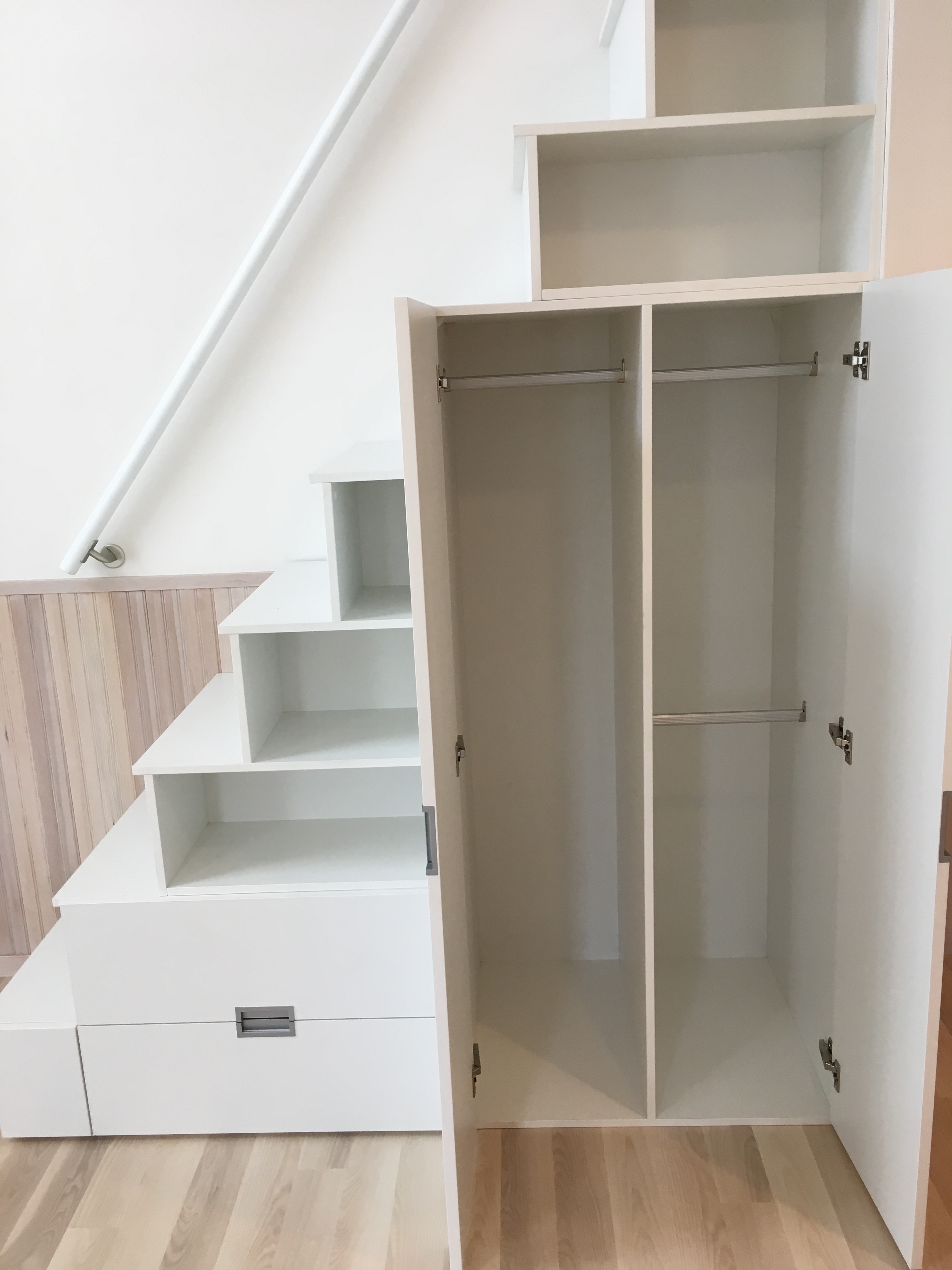 10㎡を超えるロフトが付いており、天井高も高いため、実際の面積よりもかなり広々と使っていただけます。ロフトへの昇降も、はしごではなく収納付階段を用意しましたので、楽にご利用いただけます。